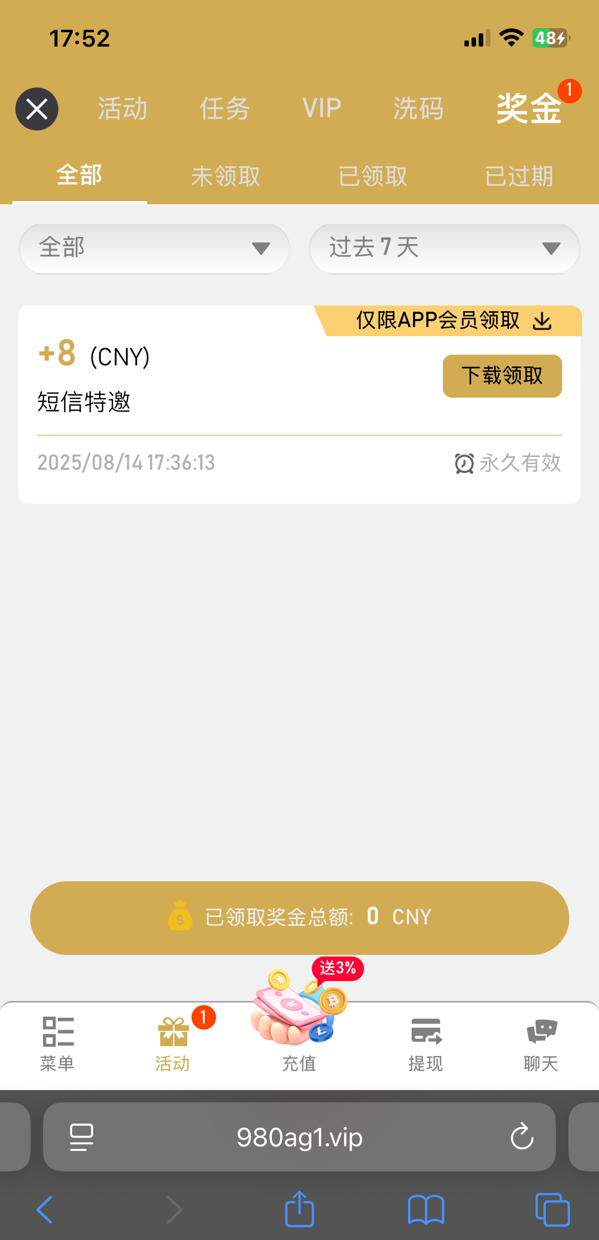 980ag1.vip 手机号注册自动弹出来验证彩金 验证码领取就行了 出款自测