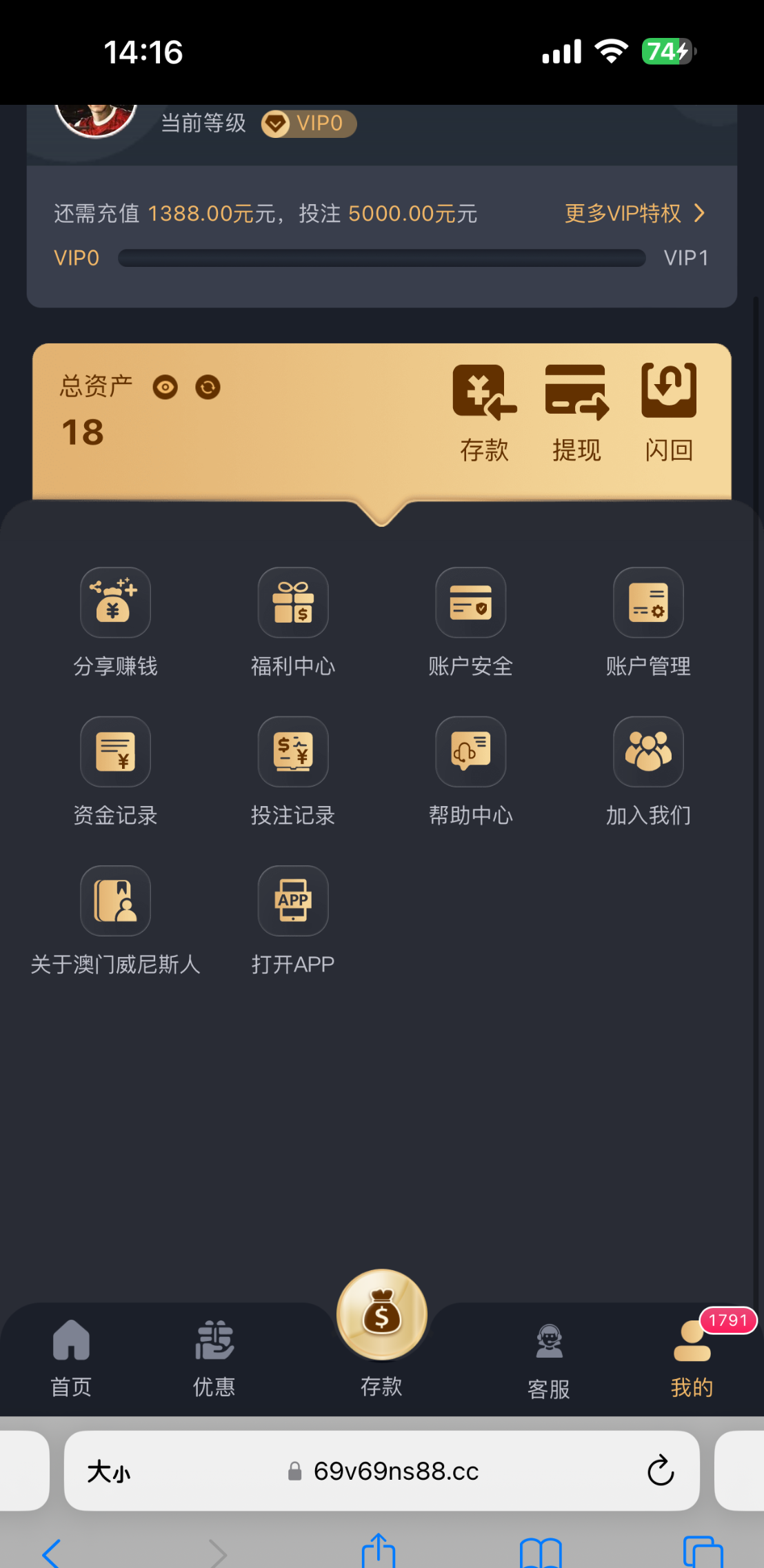 有账号找客服碰瓷去吧 这台黑不黑我不知道 打电话来的 感还是老规矩禁止充值 网站69v.com