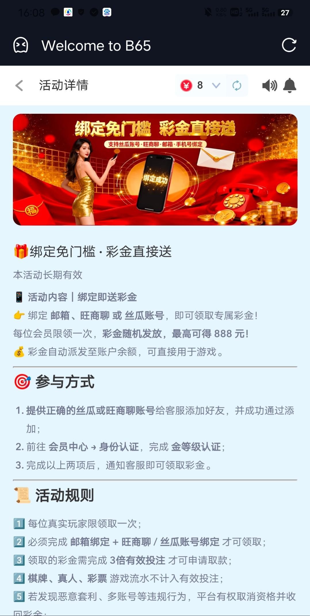 新人领8彩金,具体规则看图