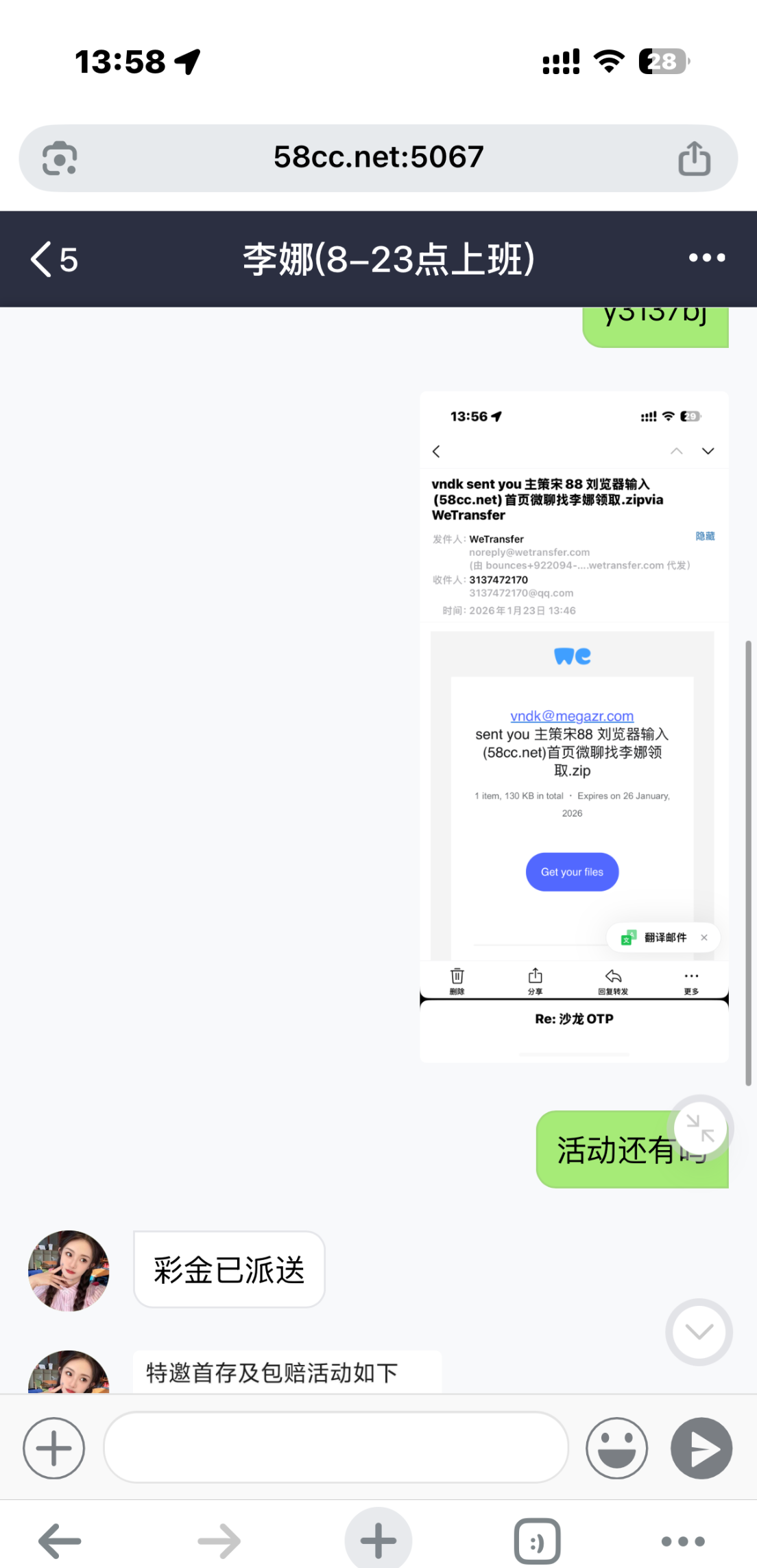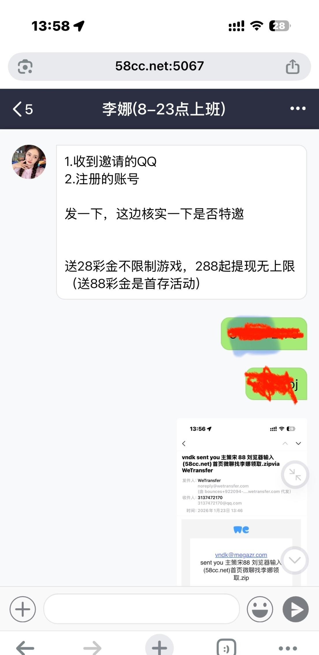 收到邮件注册的 找客服就送了28 挺秒的 还没打 出款未知 特邀链接 58cc.net